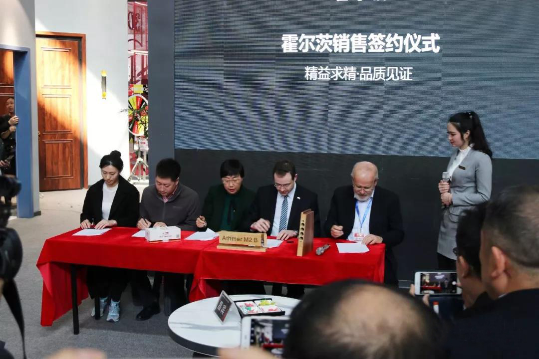 随着3月21日的到来,2018年木门行业的最大一次盛会已经如火如荼的启动了,此次更是首次北京、上海双城同展。国内T型门缔造者霍尔茨木门凭借时尚感十足的展厅和在行业首开先河的新品居室阻燃门受到了前来参展的行业各界人士的一致关注,连续两天霍尔茨展位都十分火爆。22日,霍尔茨木门携手德国邵尔兰特桥洞力学板代表胡伯特、密封材料供应方代表史提凡、五金供应方海福乐代表与来自成都的客户签订了购买协议,与众多行业嘉宾见证了这历史性的一刻,预示着霍尔茨木门在全国战略布局上又向前迈进了一步。