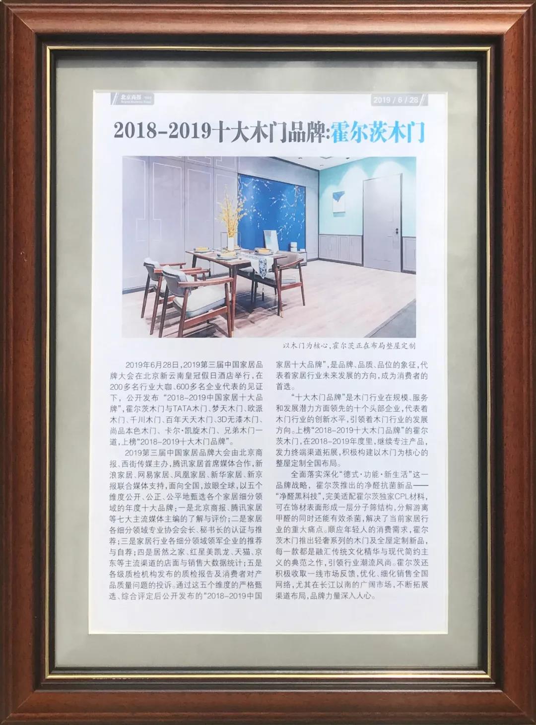 2019年6月28日,2019第三届中国家居品牌大会暨2018-2019中国家居十大品牌发布会在北京新云南皇冠假日酒店隆重开幕,在200多名行业大咖、600多名企业代表的见证下,北京商报正式发布 “2018-2019中国家居十大品牌”,33个榜单、330个品牌。其中霍尔茨木门凭借在木门领域的影响力荣膺 2018-2019中国家居十大木门品牌。
