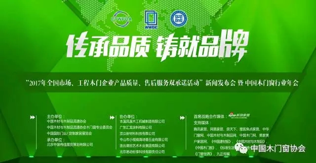 2017年3月13日,由中国木材与木制品流通协会、中国木材与木制品流通协会木门窗专业委员会、中国国际门业/ 定制家居展览会主办,北京中装伟佳展览策划有限公司承办,本溪凤溪木工机械制造有限公司、广东汇龙涂料有限公司、顶立新材料科技有限公司、中山市小榄镇海诗蔓五金有限公司、连云港班艺木业集团有限公司 、北京易动纷享科技有限责任公司协办的“2017年全国市场、工程木门企业产品质量、售后服务双承诺活动”风云 (中国)发布会暨中国木门窗行业年会在北京临空皇冠假日酒店盛大召开。