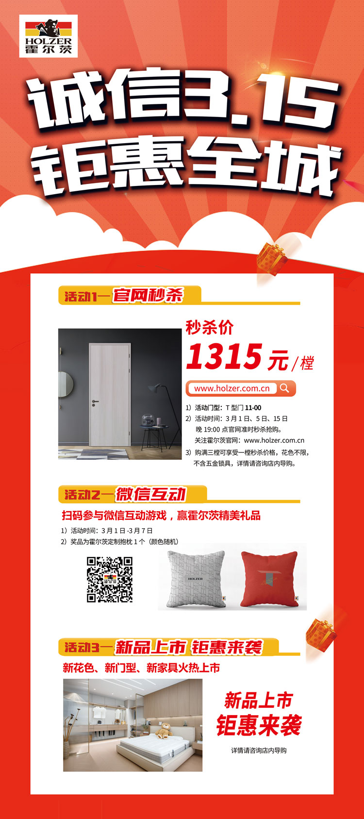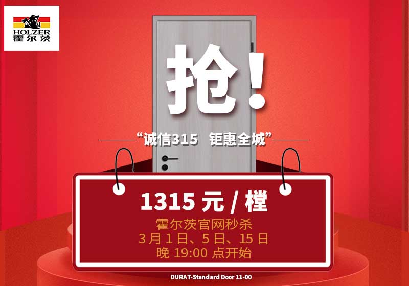 诚信315,钜惠全城!2022年3月15日19:00限时开启秒杀!秒杀门型11-00,花色不限,不含五金锁具!<凭活动识别码到霍尔茨全国任意门店参与活动>