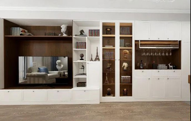 为增添大面积的收纳空间,霍尔茨从入户门的玄关柜到餐厅柜,再到电视柜,采用整面墙做收纳柜的设计手法,把一个超大空间分割成三部分,在保持主题基调的基础上,以个性化设计打造匹配每个区域的收纳柜体,提高空间的灵活性,在有限空间实现无限可能。此外,为塑造整面墙柜的美感,霍尔茨在保留大面积收纳空间的同时,预留出了一定的展示区域,通过摆放各式各样的艺术品彰显业主的品味与格调。